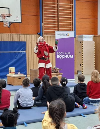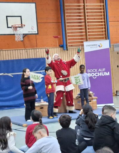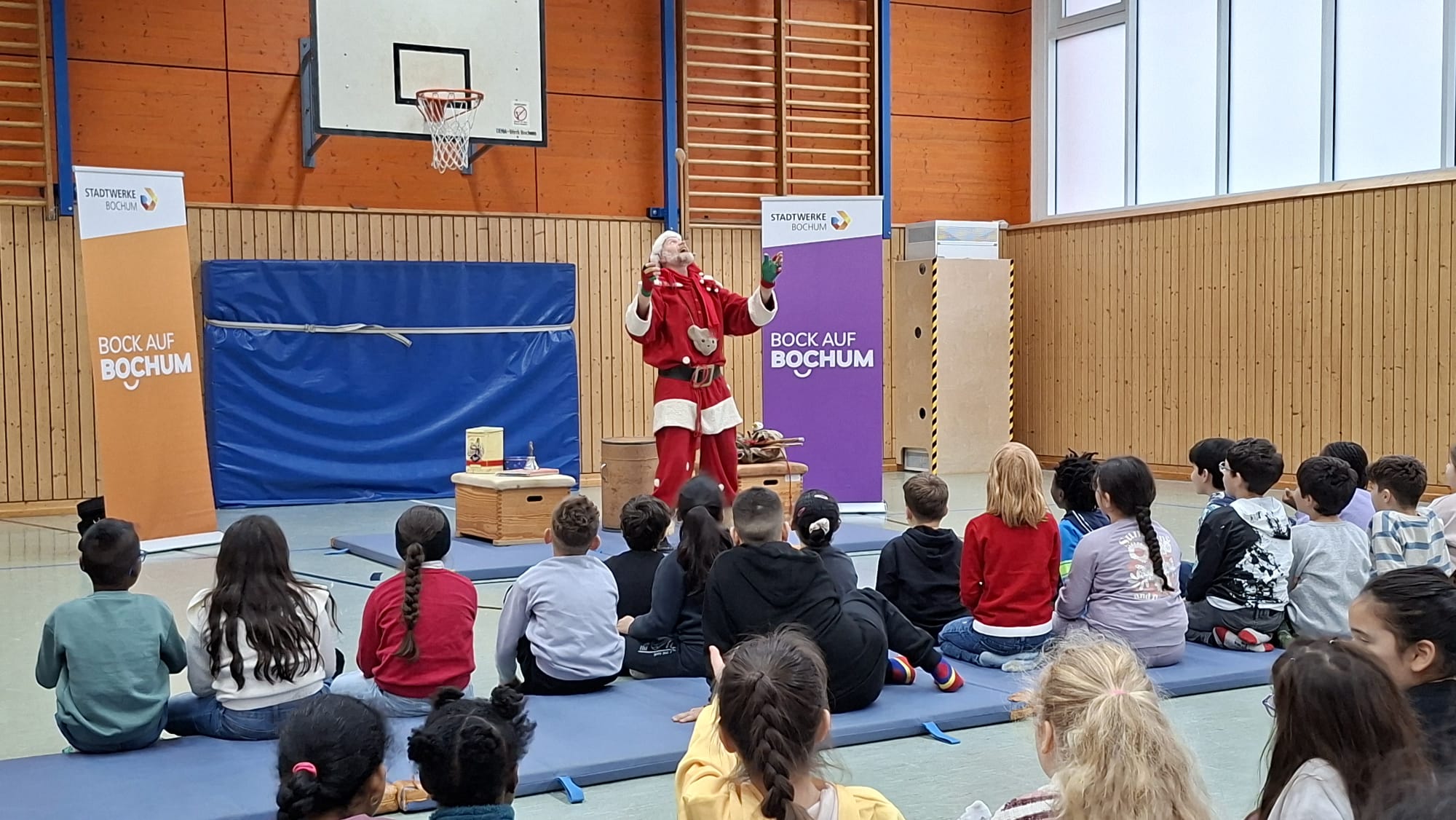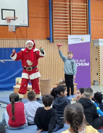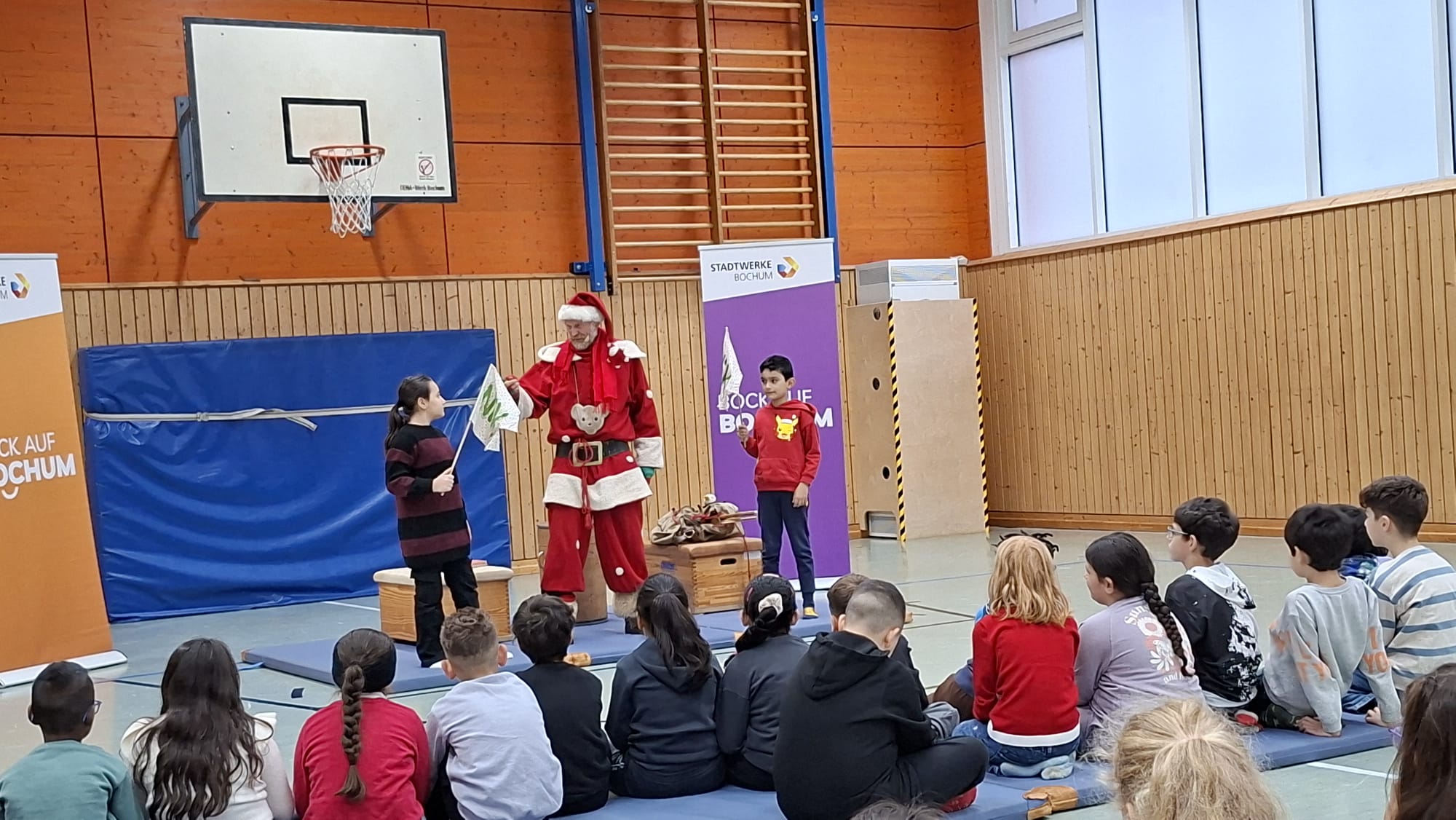 In der letzten Schulwoche vor den Weihnachtsferien konnten wir durch das Sponsoring der Stadtwerke Bochum eine für die Kinder kostenfreie Theateraufführung durchführen. Jedes Jahr Ende November beginnt der Weihnachtsmann seine Arbeit auf der Erde. Diesmal steht er mit Überraschungen beladen vor den Zuschauern und erklärt, dass er gerade aus einem Zirkuszelt kommt. Am Ende des Besuchs wird der Weihnachtsmann nur unter der Voraussetzung entlassen, dass er trotz seines hohen Alters die Kunststücke, die er soeben erblickt und einstudiert hat, auch den Kindern der Maarbrücke vorführt. Kinder und Lehrkräfte hatten sehr viel Spaß an der kurzweiligen und sehr kindgerechten Aufführung.
