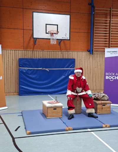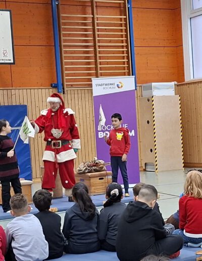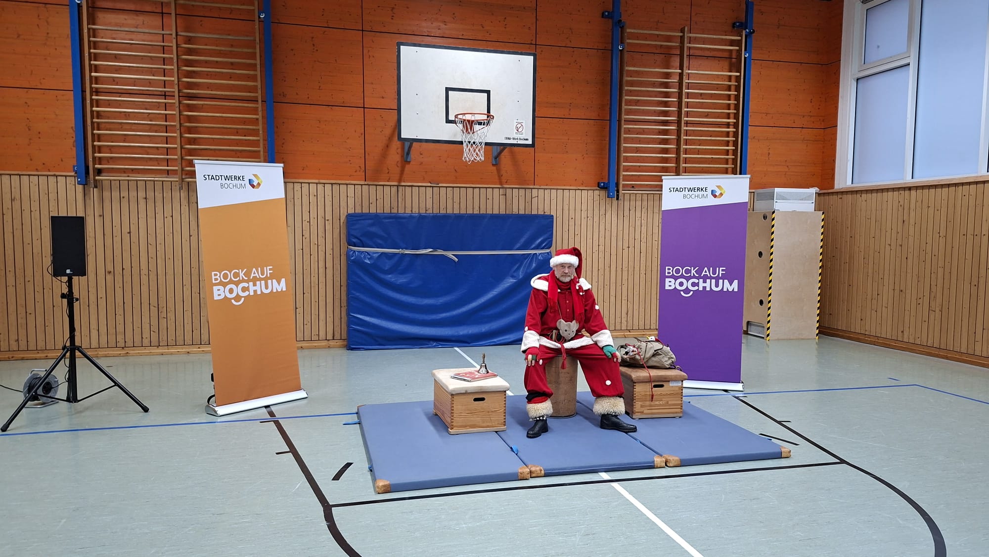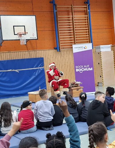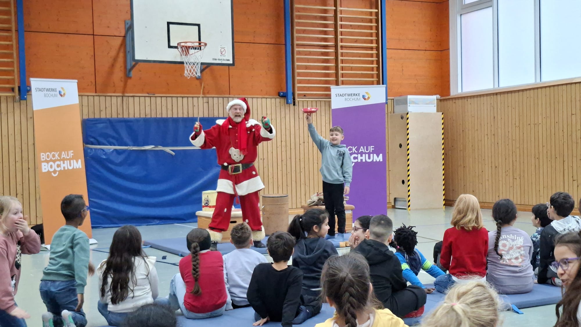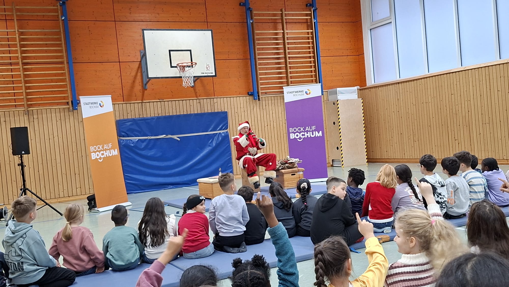 In der letzten Schulwoche vor den Weihnachtsferien konnten wir durch das Sponsoring der Stadtwerke Bochum eine für die Kinder kostenfreie Theateraufführung durchführen. Jedes Jahr Ende November beginnt der Weihnachtsmann seine Arbeit auf der Erde. Diesmal steht er mit Überraschungen beladen vor den Zuschauern und erklärt, dass er gerade aus einem Zirkuszelt kommt. Am Ende des Besuchs wird der Weihnachtsmann nur unter der Voraussetzung entlassen, dass er trotz seines hohen Alters die Kunststücke, die er soeben erblickt und einstudiert hat, auch den Kindern der Maarbrücke vorführt. Kinder und Lehrkräfte hatten sehr viel Spaß an der kurzweiligen und sehr kindgerechten Aufführung.